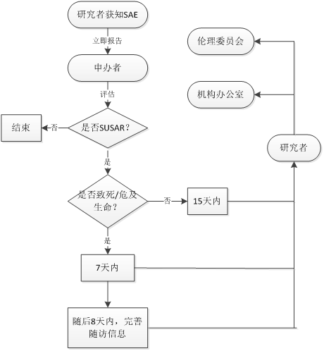 研究者获知SAE后立即(24小时内)书面报告申办者,同步报告机构办公室和伦理委员会。妊娠事件报告按SAE流程报告。