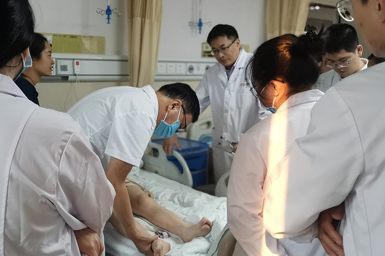 李忆农教授深入该院风湿免疫科,与科室主任潘存伟一同参观了病区,了解科室开展的疾病诊疗业务、仪器设备、病房设施及人员配备等情况。随后,李忆农教授来到病房,对正在住院的多个疑难患者仔细查体及详细询问病史,结合自身临床体会,给予了诊治意见。