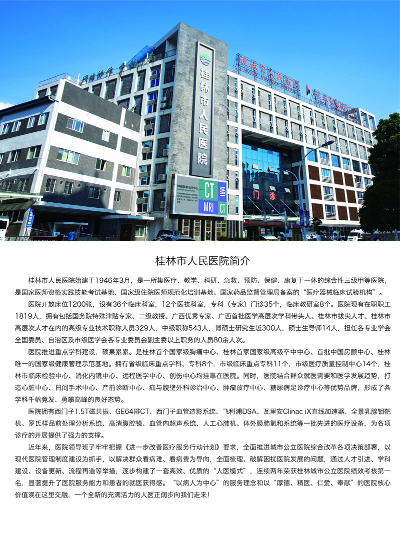 桂林市人民医院前身是1946年3月成立的桂林市公立医院,建院时仅有残破平房三座,全院工作人员56人。1950年7月更名为桂林市立医院,1951年6月1日改为桂林市立人民医院,1963年定名为桂林市人民医院并一直沿用至今...