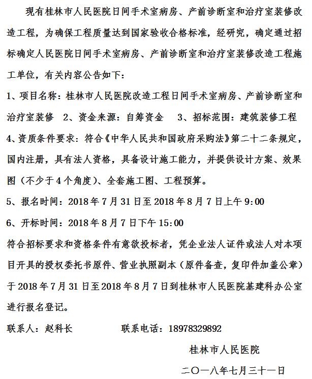 桂林市人民医院日间手术室病房、产前诊断诊室和治疗室装修改造工程招标公告