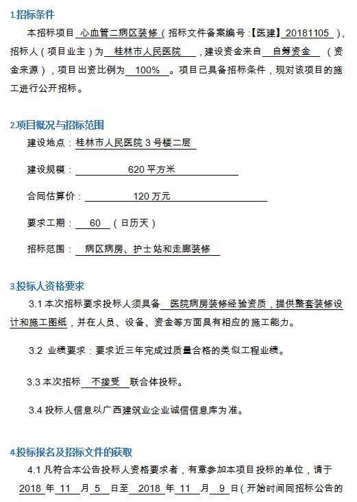桂林市人民医院心血管二病区装修项目施工招标公告