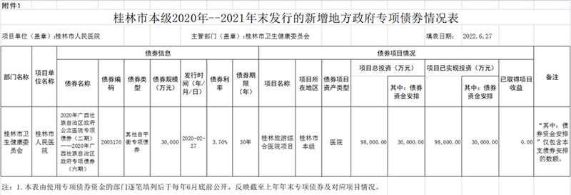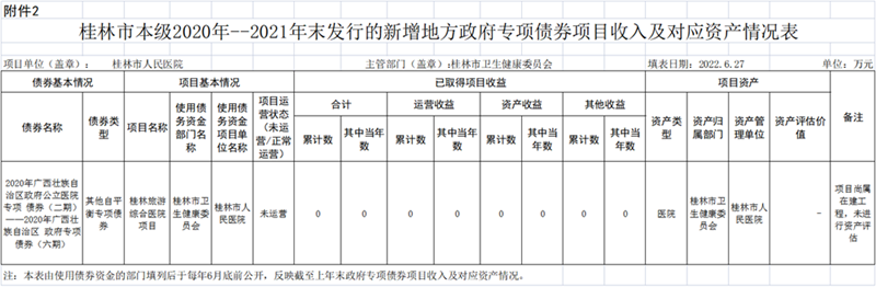 截至2021年末,我院获得2020年广西壮族自治区政府公立医院专项债券(二期)一一2020年广西壮族自治区政府专项债券(六期),债券资金30,000万元,于2020年2月28日已到位。具体见附件。