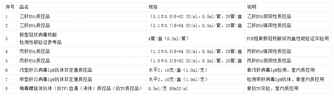 用于ISO15189项目,进行室内质控用,详见下表:
