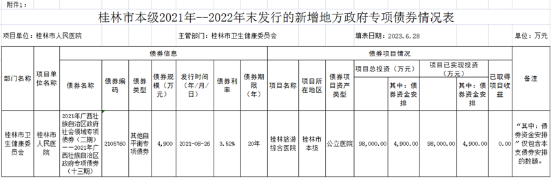 截至2022年末,我院获得2021年广西壮族自治区政府社会领域专项债券(二期)——2021年广西壮族自治区政府专项债券(十三期),债券资金4,900万元。具体见附件。
