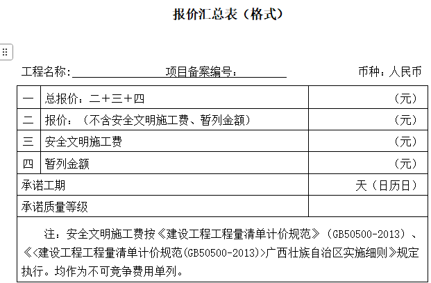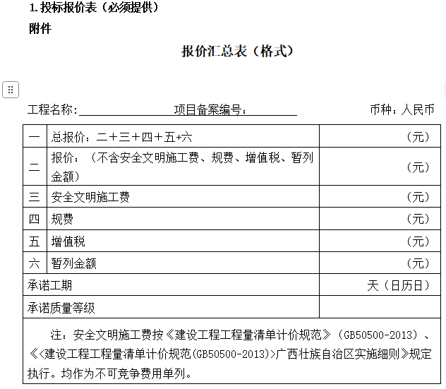 1 | 招标文件第五章投标文件格式 :响应函第1点 | 1.根据你方项目编号为 ( 项目编号) 的 (工程项目名称)议价文件,遵照《中华人民共和国招标投标法》等有关规定,经研究上述议价文件、合同条款、图纸、工程建设标准和工程量清单及其他有关文件后,我方愿意以投标总报价人民币(大写) 元(¥ 元)(其中:投标报价(大写) 元(¥ 元)、安全文明施工费¥ 元、规费¥ 元、增值税¥ 元、暂列金额 元),并按上述图纸、合同条款、工程建设标准和工程量清单(如有时)的条件要求承包上述工程的施工、竣工,并承担任何质量缺陷保修责任。我方保证工程质量达到 等级。 | 1.根据你方项目编号为 ( 项目编号) 的 (工程项目名称)议价文件,遵照《中华人民共和国招标投标法》等有关规定,经研究上述议价文件、合同条款、图纸、工程建设标准和工程量清单及其他有关文件后,我方愿意以投标总报价人民币(大写) 元(¥ 元)(其中:投标报价(大写) 元(¥ 元)、安全文明施工费¥ 元、暂列金额 元),并按上述图纸、合同条款、工程建设标准和工程量清单(如有时)的条件要求承包上述工程的施工、竣工,并承担任何质量缺陷保修责任。我方保证工程质量达到 等级。 |