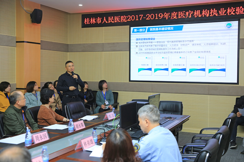 10月28日,自治区卫健委医疗机构执业校验专家组一行5人来到桂林市人民医院,就2017—2019年度医疗机构执业校验开展现场审查工作,医院院长王昌明、党委书记谭宇、党委副书记张惠成、周永国、副院长胡永葵、总会计师杨春瑜及相关职能部门负责人参加了迎检工作。