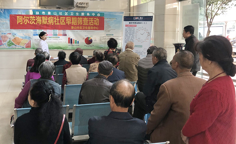 11月15日上午,桂林市象山社区卫生服务中心的医护志愿者们,在中心内开展了老年痴呆症社区早期筛查活动,共为50多名60岁以上辖区居民进行了筛查和相关科普知识宣讲。