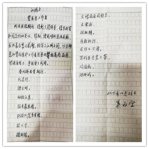 我在住院期间,得到了院领导、很多科室和同志们的关心、帮助,使我顺利医治疾病,在此表示衷心感谢,特写了江城子词,以示谢意和赞扬医务工作者德医双馨的高尚品质,望继续努力,争取更大成绩。