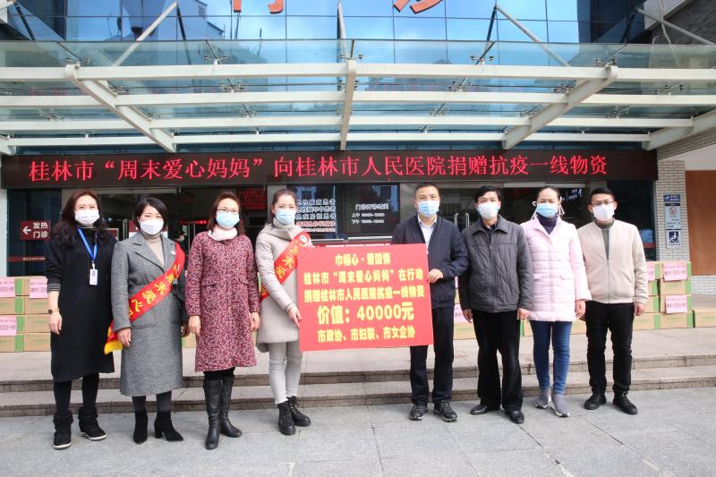 2月13日下午,桂林市妇联、女企协、“周末爱心妈妈”志愿服务队向市人民医院捐赠了2100瓶乙醇消毒液、800个医用橡胶手套和300瓶84消毒液等医疗物资。