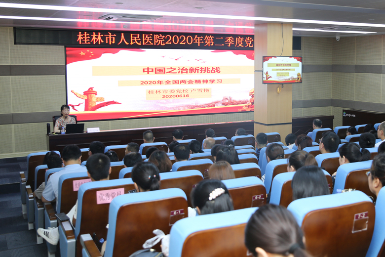 学习“两会”精神,增强民族自信心。医院特邀桂林市委党校老师卢雪艳上了一堂题为《中国之治新挑战》的专题党课,党课紧紧围绕2020年“两会”精神这条主线,全面、系统、生动的解读了“两会”的基本概念、2020年政府工作报告、习近平的“两会”时间、“两会”精神的三条主线等4个方面内容,精辟阐述了非常之年政府推进经济社会发展所采取特殊之举措,让广大干部职工对两会精神有了更深的体会,增强了中国赢得全面胜利的决心和信心。近250名在职党员到场接受了教育。