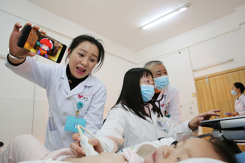 为了让患儿配合做心脏超声,路华护士长拿出手机给患儿播放动画片