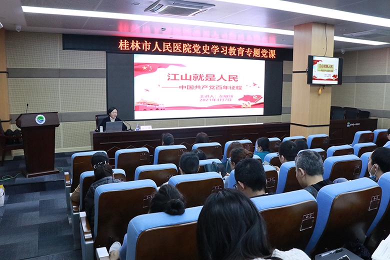 4月7日下午,广西党史专家库专家、主任编辑、原中共桂林市委党史研究室副主任彭敏翎应邀来到桂林市人民医院,为该院党员干部作了题为《江山就是人民——中国共产党百年征程》的专题授课,这也是该院举办党史学习系列活动之一。党委副书记、纪委书记赖玉珊主持讲座。