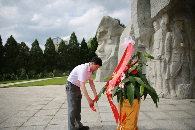 首先,大家来到红军烈士碑前向革命烈士敬献花篮,党委书记谭宇为花篮整理绶带。在场人员列队,怀着无比崇敬的心情向烈士行三鞠躬礼。