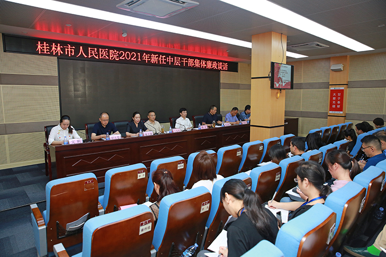 为促使医院新任中层干部进一步增强廉洁自律意识,增强拒腐防变的能力,扎实工作,履职尽责,取得新的成绩。6月7日下午,桂林市人民医院在学术报告厅举行新任中层干部集体廉政谈话会议。全体院领导出席会议,医院党委副书记、纪委书记赖玉珊向全院2021新任中层干部做了集体廉政谈话。