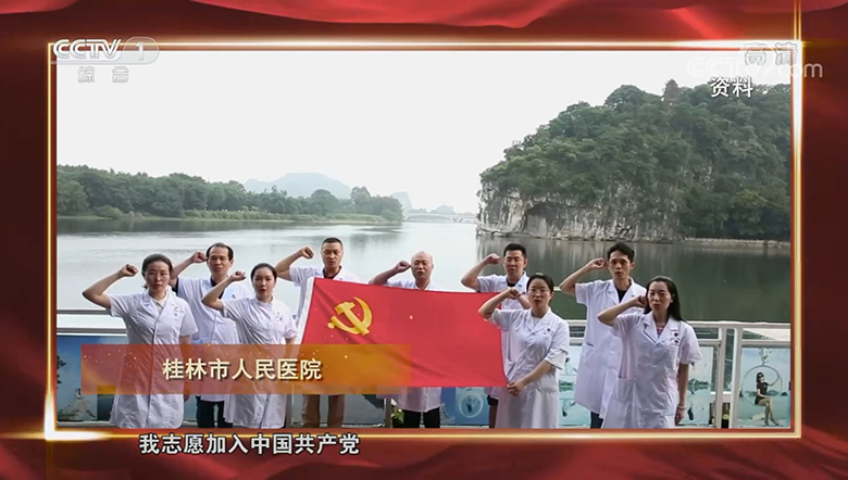 时间来到7月4日,反映医务人员白衣执甲,不负患者以生命相托;潜心钻研,攀登一个个医学高峰;严于律己,以理想信念做开路先锋的专题节目《不忘初心 牢记使命》在央视综合频道如约而至。在节目进行到18分36秒时,一组医务人员面向党旗宣誓镜头出现。令人惊喜的是,第一个镜头是来自桂林市人民医院。“我宣誓,我志愿加入中国共产党”,在桂林的山水间,这一声入党誓词铿锵有力,桂林市人民医院党员我无人员充当了“领誓人”的角色,与后续来自全国各个医院一个个医务人员宣誓的镜头,汇聚起“不忘初心、牢记使命”的强大力量。