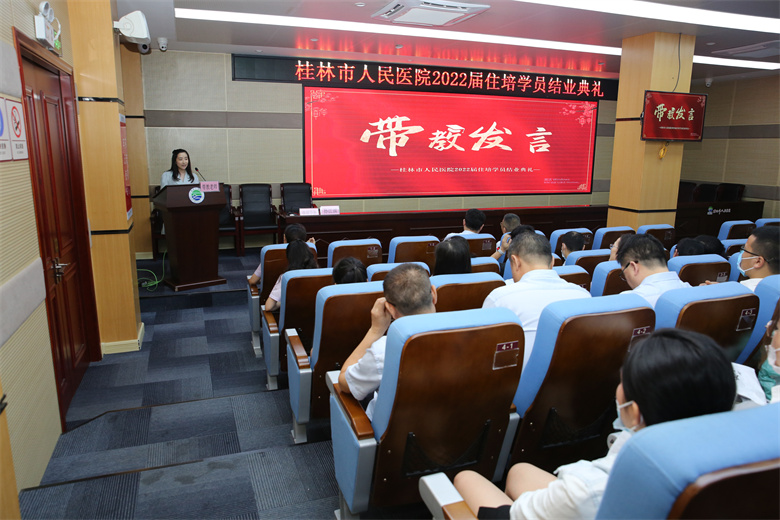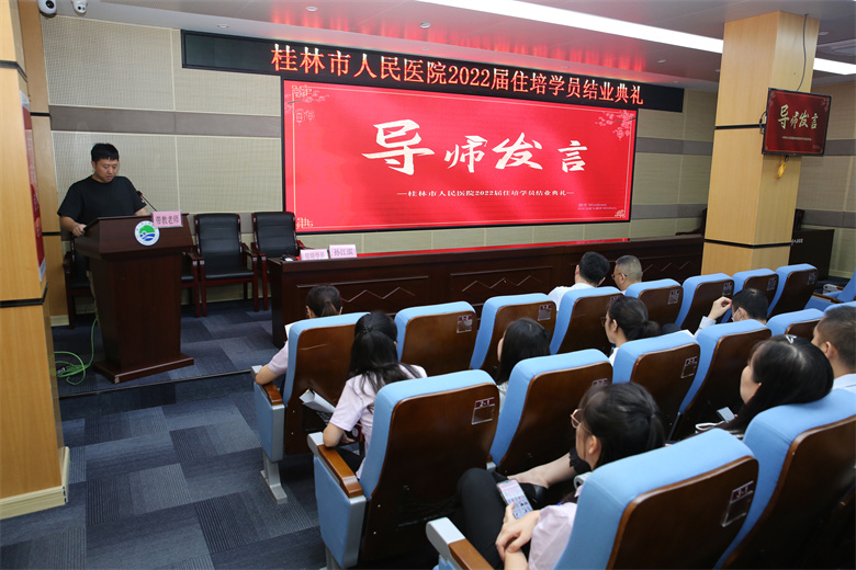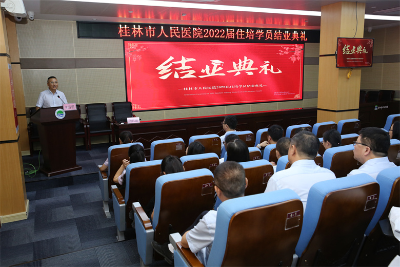 6月20日下午,桂林市人民医院在学术报告厅举行2022年住院医师规范化培训结业典礼。王昌明院长、孙江滨副院长、各专业基地负责人、教学主任代表、教学秘书代表、责任导师代表、带教老师代表及全体2022届住培医师参加典礼。