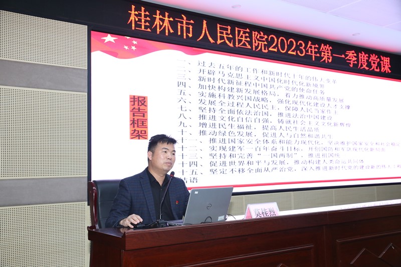 为深入学习宣传贯彻党的二十大精神,切实把党的二十大精神转化到真抓实干的具体工作中去,3月23日下午,桂林市人民医院邀请中共桂林市委党校副校长、副教授、桂林市党史专家库专家、广西青年讲师团和桂林市宣讲团专家莫桂烈作专题授课。