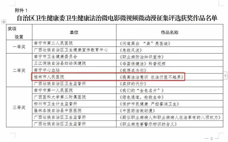 近日,自治区卫生健康委公布了卫生健康法治微电影微视频微动漫征集评选结果,经专家评审及网络展播投票,评选出获奖作品25部,其中,桂林市人民医院选送的微视频《提高法治意识 依法行医不越界》上榜获得二等奖。