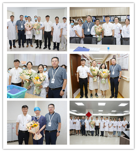 9月10日上午,正值第40个教师节到来之际,桂林市人民医院院长秦科、副院长孙江滨带队深入临床,手握鲜花,怀揣着满满的敬意和关怀,慰问了在一线工作中的教师代表们,并以此向全院的临床教师们送上节日的祝福。