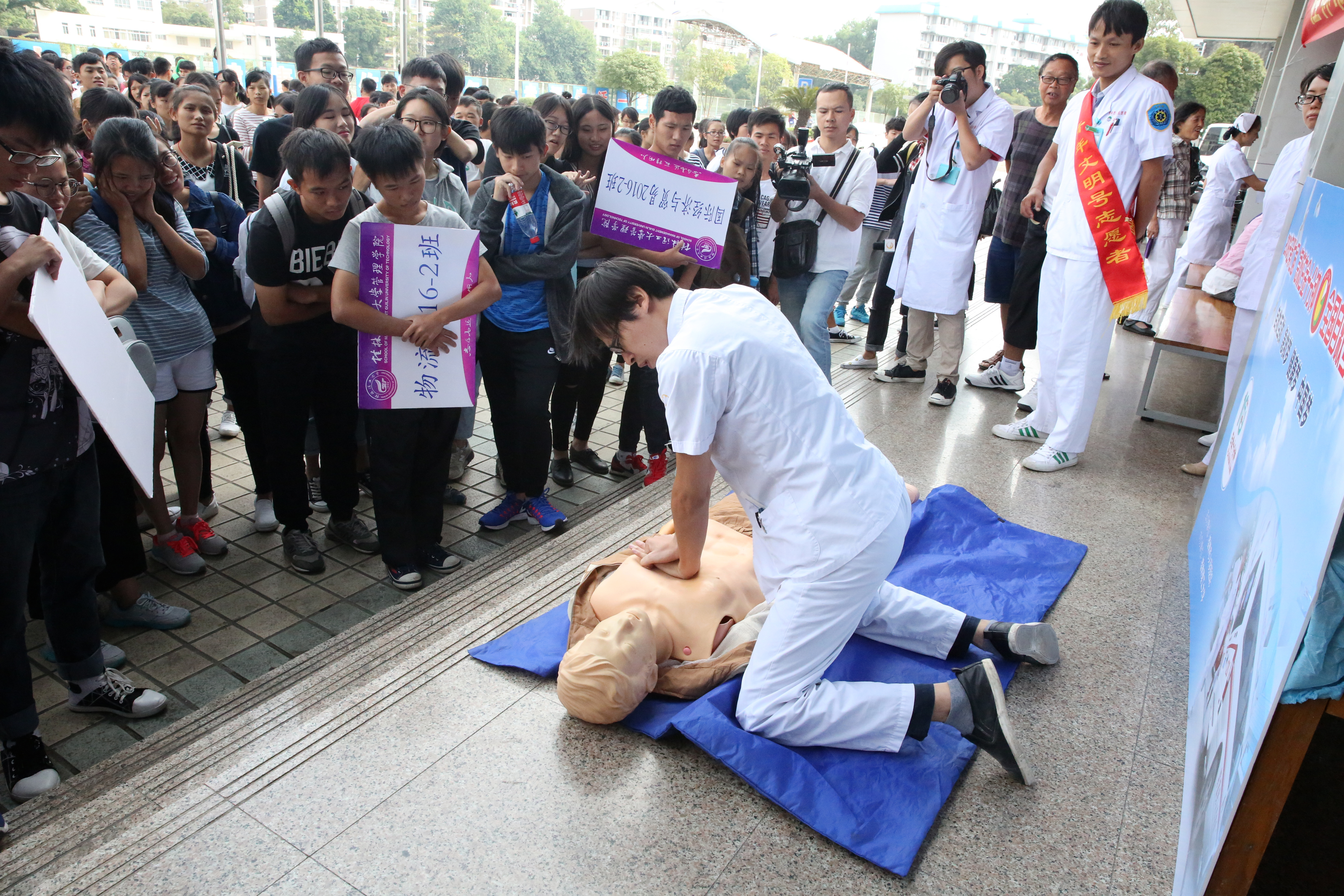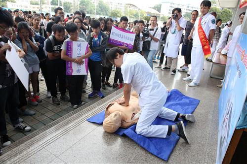 10月10日上午10点10分,“急救白金十分钟 全国自救互救日”桂林站活动在桂林理工大学体育馆前正式开始,来自桂林市人民医院的急诊科、心血管内科、神经内科以及内分泌科的专家们开展义诊宣教活动。专家们一边给在校的学生老师们演示心肺复苏和简单的止血包扎等急救互救的方法,一边为离退休职工、家属们进行义诊、咨询。据了解,“急救白金十分钟 全国自救互救日”活动,2010年开展以来至今已举办了七届。活动意在向大众宣传普及急救知识和技能,达到降低意外伤病死亡率,减少伤残率的目的。(黄薇)