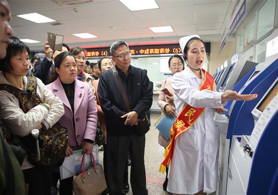 来自自治区卫生计生委、全区各地的卫计系统工作人员代表分两批到我院进行了参观,实地了解了居民健康卡在我院的发卡及使用情况。工作人员向大家演示了自助发卡、现场激活、预约挂号、取消预约、就诊、自助缴费、打印检验报告、取药等功能,部分就诊患者进行了现场体验。(吴曼莉)