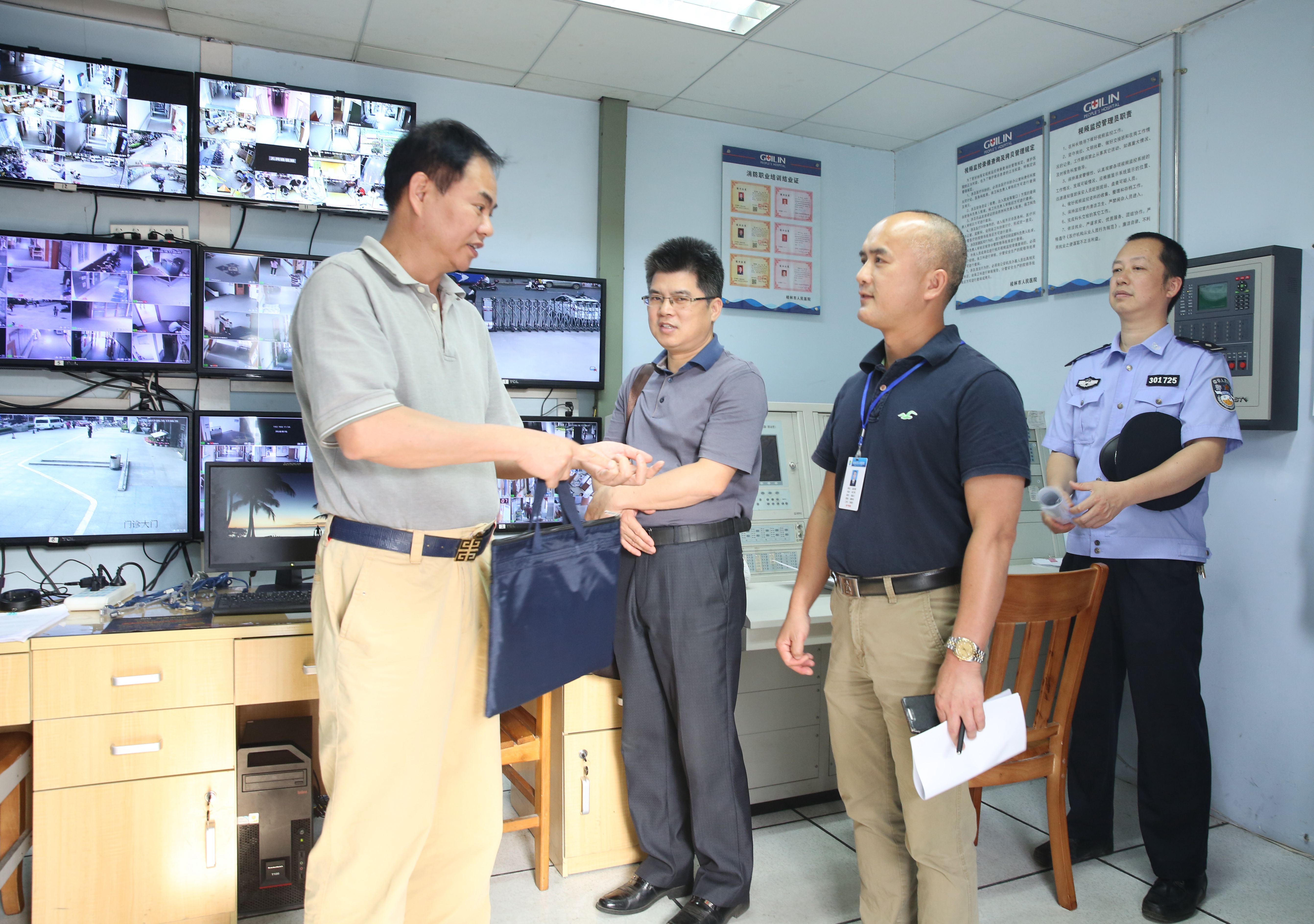 督导组一行人通过现场检查、重点人员访谈、查阅台账等方式,走访了门诊、急诊、住院部等医院安防重点区域,查看了警务室、监控室以及投诉接待室,并向现场工作人员了解相关工作开展情况。