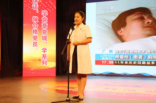 据悉,这次由市直机关工委组织和举办的演讲比赛在桂林电视台录播大厅举行。为了办好本次比赛,市直机关各基层单位党组织经过层层筛选,共有55名选手参与了初赛选拔,最终由市卫计委、市公安局和市地税局等20个单位的优秀选手入围决赛。比赛中,黄慰紧扣“永远跟党走”的主题,以“不忘初心跟党走,情系百姓护健康!”为题,结合我院门诊党支部党员潘淳不顾腿受伤,坐着轮椅捐赠造血干细胞救助濒临危机的白血病患者和外科党支部党员秦庆发冒雨救助受伤路人的真实故事为典型事例,真切地抒发了白衣天使们乐于助人的奉献精神和对医疗事业的无比忠诚。她用时而高亢激昂的情感、时而声情并茂的倾诉,把我市共产党员们立足岗位比奉献的精神风貌展现得淋漓尽致。精彩的演讲引发了在场观众和所有评委的强烈共鸣,深深打动了在场每一个人的心。经过激烈角逐,我院团委书记、青年党员黄慰最终一举夺冠,荣获本次演讲大赛的一等奖。
