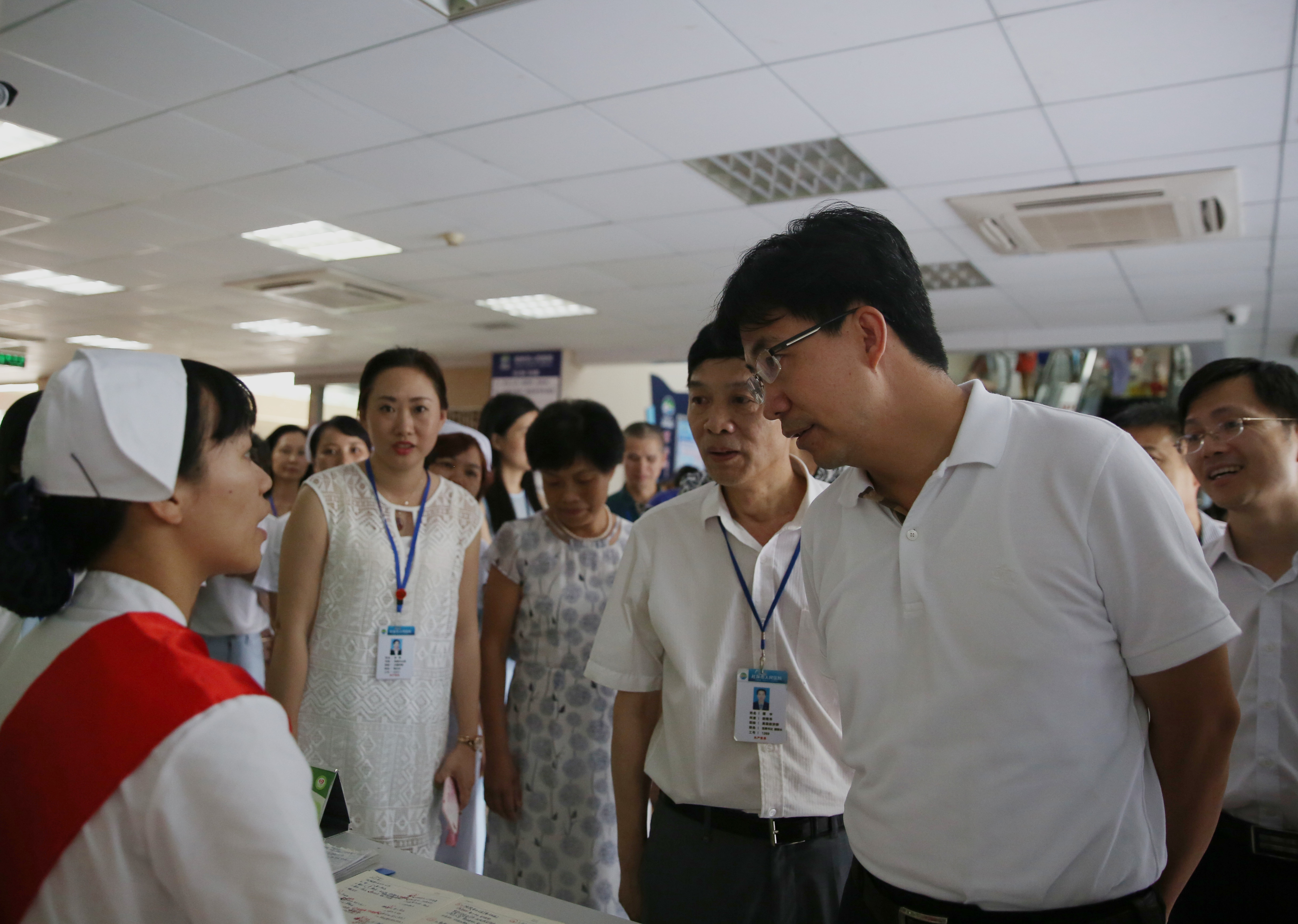 督查组一行首先来到门诊大厅,实地查看该院挂号、收费、取药等服务窗口的就诊秩序,重点查看了医院的就诊流程、投诉渠道、文明服务等情况。巡查过程中,何翔副市长还与志愿者服务岗的工作人员进行交流,详细了解志愿者服务的值班安排情况并对她们的辛勤付出表示感谢。此时,放置在导医台上的自动测量血压仪及便民盒,引起了督查组成员的注意,对于这一贴心的便民措施,何翔副市长表示很欣慰;在入院接待处,一位大爷正在接受入院接待服务,何翔副市长饶有兴致的走上前去询问:“伯伯,您今天来住院感受怎么样?”“很好啊,好快好方便了,这里还有护士直接带我去病房。”大爷一脸轻松的回答。何翔副市长通过与大爷的交谈,了解到该院入院手续的办理流程,他认为,医院在门诊增设入院接待处和入院手续办理处的做法,极大地方便了患者就医,是医院改善服务,提高患者满意度的很好的举措。随后,督查组成员深入院区,从榕树园经棕榈园到桂花园,一路走一路看,对该院的整体环境卫生及创城氛围进行实地督查。