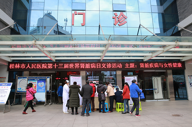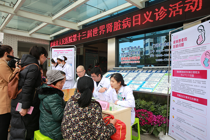 3月8日,是国际劳动妇女节,同时也是第十三个世界肾脏病日,当天上午,桂林市人民医院肾内科在医院门诊楼前举办义诊活动,肾内科医护人员团队为前来咨询的市民开展免费肾病咨询和测血压、测血糖等活动,得到了市民的点赞。