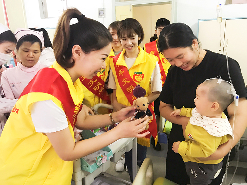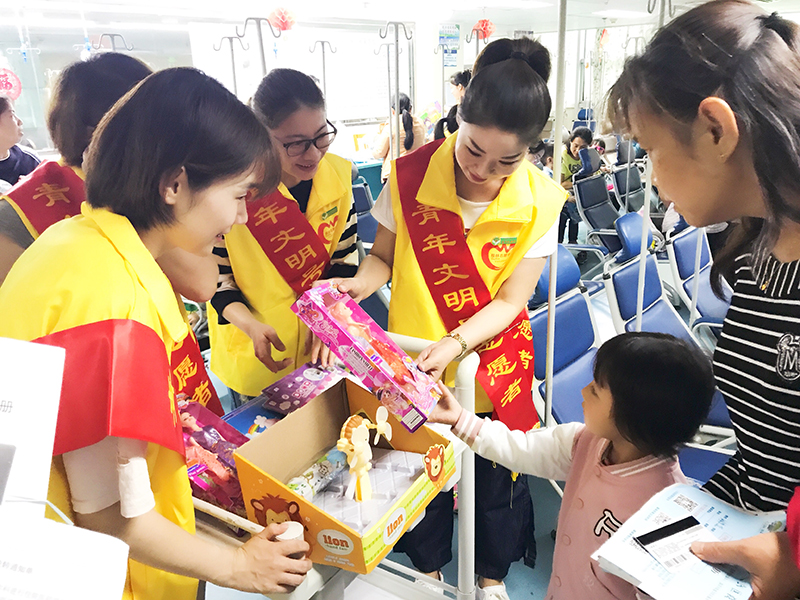 6月1日上午,桂林市人民医院团委组织青年志愿者到儿科病房、门诊和急诊为小患儿派发飞机模型、芭比娃娃、彩绘蛋和毛绒玩偶等丰富的六一儿童节礼物,给他们带去了节日的问候,鼓励他们勇敢战胜病魔。