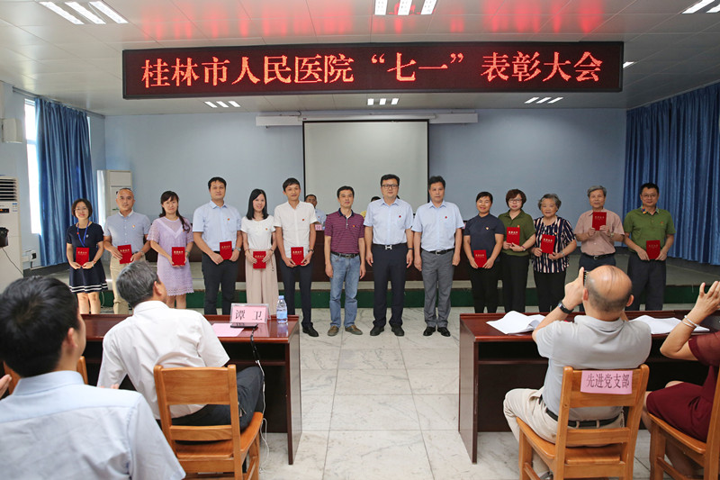 6月28日,桂林市人民医院在礼堂召开“七一”表彰大会,对过去一年医院涌现出的先进党组织和优秀党员进行表彰。院党委副书记、院长王昌明出席会议并发表讲话。党委副书记、纪委书记张惠成出席并宣读表彰决定,党委副书记周永国主持会议,副院长唐建东、覃文怀、梁勇出席会议,副院长谭卫列席会议。