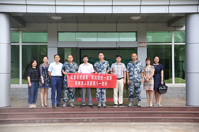“八一”建军节来临之际,桂林市人民医院党政主要领导带队,分别走访慰问共建单位桂林某预备役通信团和桂林空军某部,为他们送去了节日的问候和慰问品,向人民子弟兵致以崇高的敬意,受到部队官兵的热烈欢迎。