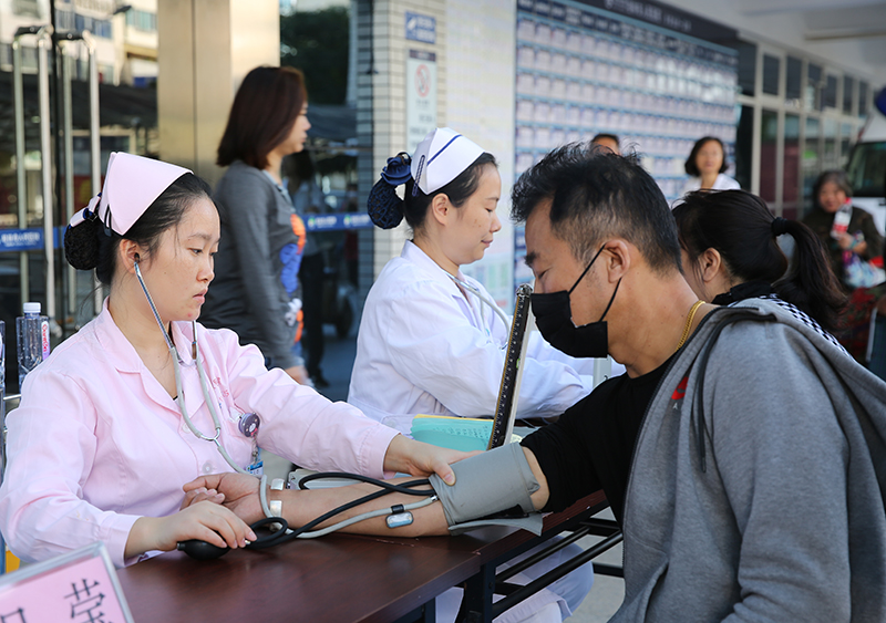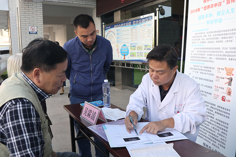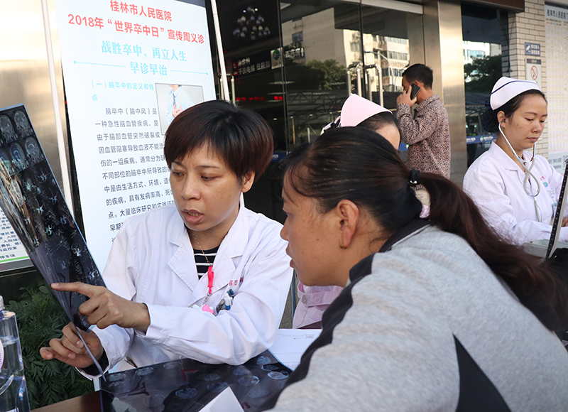 10月31日上午,来自桂林市人民医院医院神经内科、康复医学科等医护人员,在院门诊大楼前开展“世界卒中日”宣传周义诊活动。向患者科普早发现早治疗的健康意识和术后康复训练的重要性。