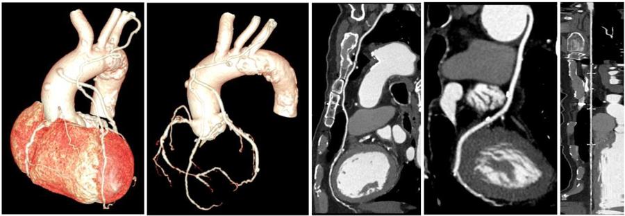 冠脉搭桥术后血管评价,16厘米宽体探测器覆盖整个桥血管范围,心脏轴扫采用 3D 蜂巢准直器和 Volume HD 宽体重建算法,极大地降低了噪声和伪影对图像的干扰,在较低辐射剂量下清晰显示桥血管、瓣膜置换情况及残存冠脉影像。