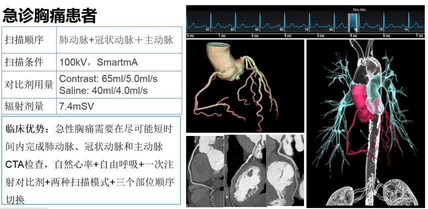 对比传统CT检查一个部位需要注射一次造影剂,Revolution CT可以注射一次造影剂,一次性完成冠状动脉CTA、肺动脉CTA及主动脉CTA等多部位CTA检查,得到高对比度的影像图,不仅安全,还省心省力省时更省钱。