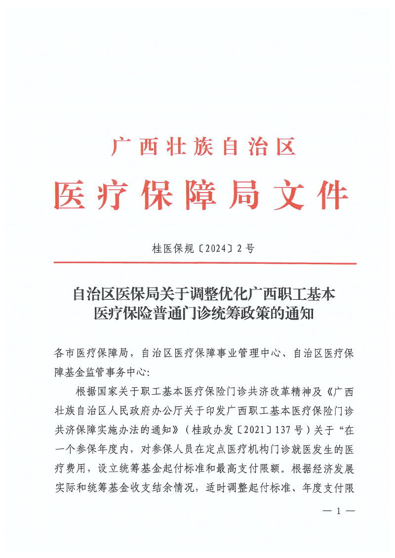 桂医保桂【2024】2号 自治区医保局关于调整优化广西职工基本医疗保险普通门诊统筹政策的通知