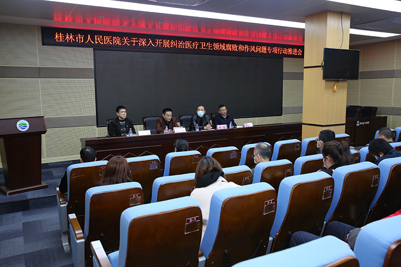 3月23日,桂林市人民医院深入开展纠治医疗卫生领域腐败和作风问题专项行动推进会在学术报告厅召开,就进一步深入推进专项行动进行再动员、再部署和再强调。市纪委监委领导张文波、市卫健委党组成员、市老龄办主任李荣、医院领导班子成员、医院主要科室负责人参加推进会。