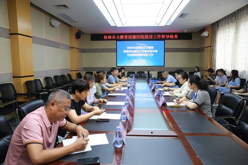 为推动全面深化清廉医院建设,8月17日下午,桂林市卫生健康委四级调研员蒋碨鸿一行9人来到桂林市人民医院就该院清廉医院建设及“领导干部利用职权或影响力插手工程项目谋私贪腐问题、医疗物资采购腐败问题专项整治工作、信访积案久拖不结”进展情况进行专项调研督导。医院党委书记王畅以及医院领导班子成员,相关科室负责人参加了督导调研。