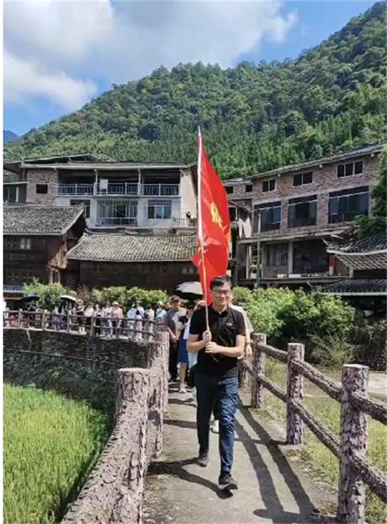 讲解结束后,全体党员整齐佩戴党徽,迈着矫健的步伐沿着当年红军长征路线前进,身临其境感受“红军不怕远征难”的艰苦革命历史征程。烈日当头,山路崎岖,全体党员经过一个多小时的徒步行走到达万人界红军烈士墓。